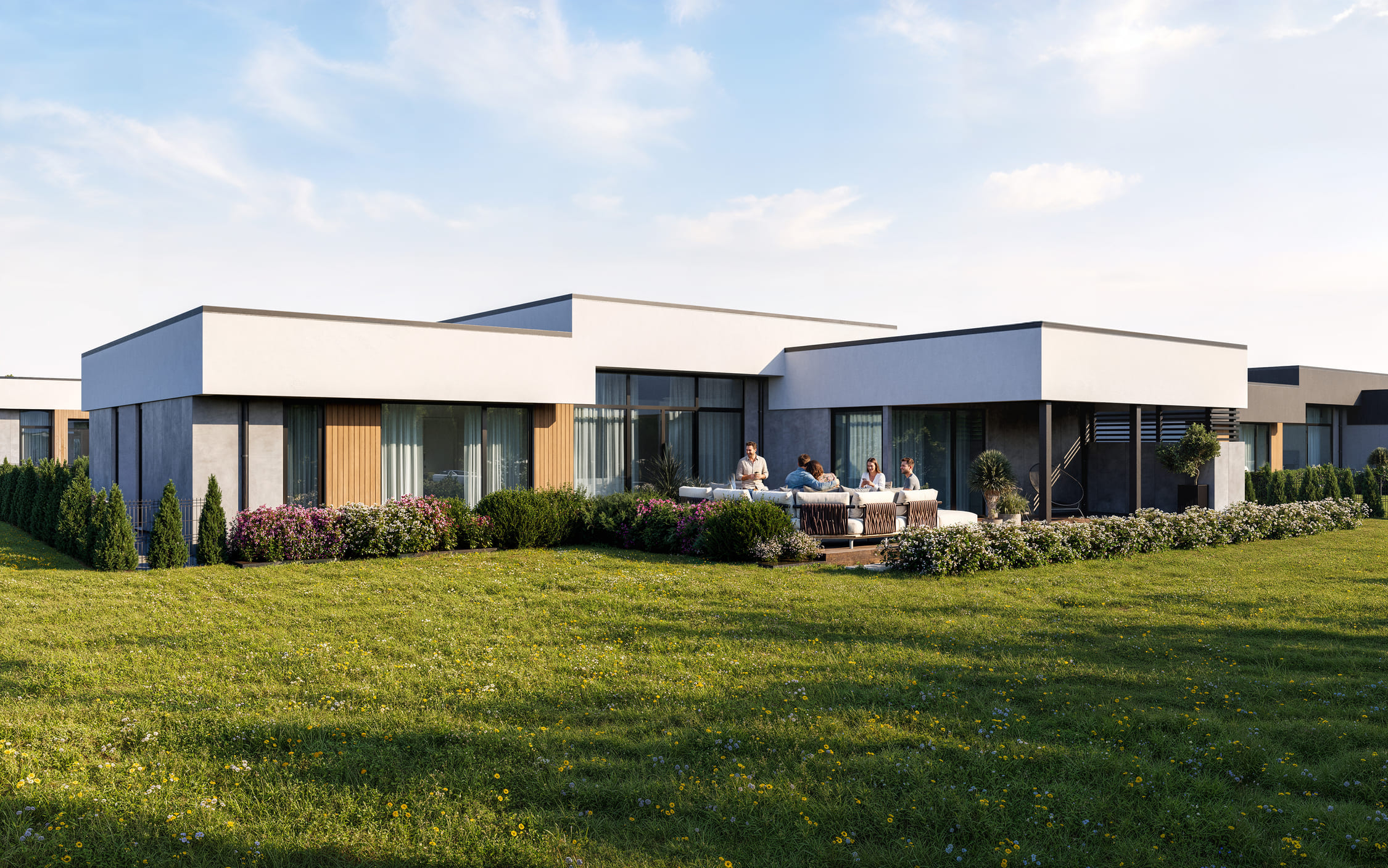 Pilkupüüdev modernne arhitektuur ja hea planeering loob hubase kodu, kus iga detail on läbimõeldud. Hoonete välisviimistluses kasutatakse kvaliteetseid heleda ja tumedatoonilisi plaate, mis on kombineeritud looduslähedaste puitdetailidega, andes hoonetele modernse ja ajatu välisilme. Suured tumeda raamiga aknad lisavad hoonetele isikupära ning toovad siseruumidesse rohkelt päevavalgust. Energiatõhus maaküte ja soojustagastusega ventilatsioon säästavad keskkonda, hoiavad küttekulud madalal ning tagavad hea elukvaliteedi.
